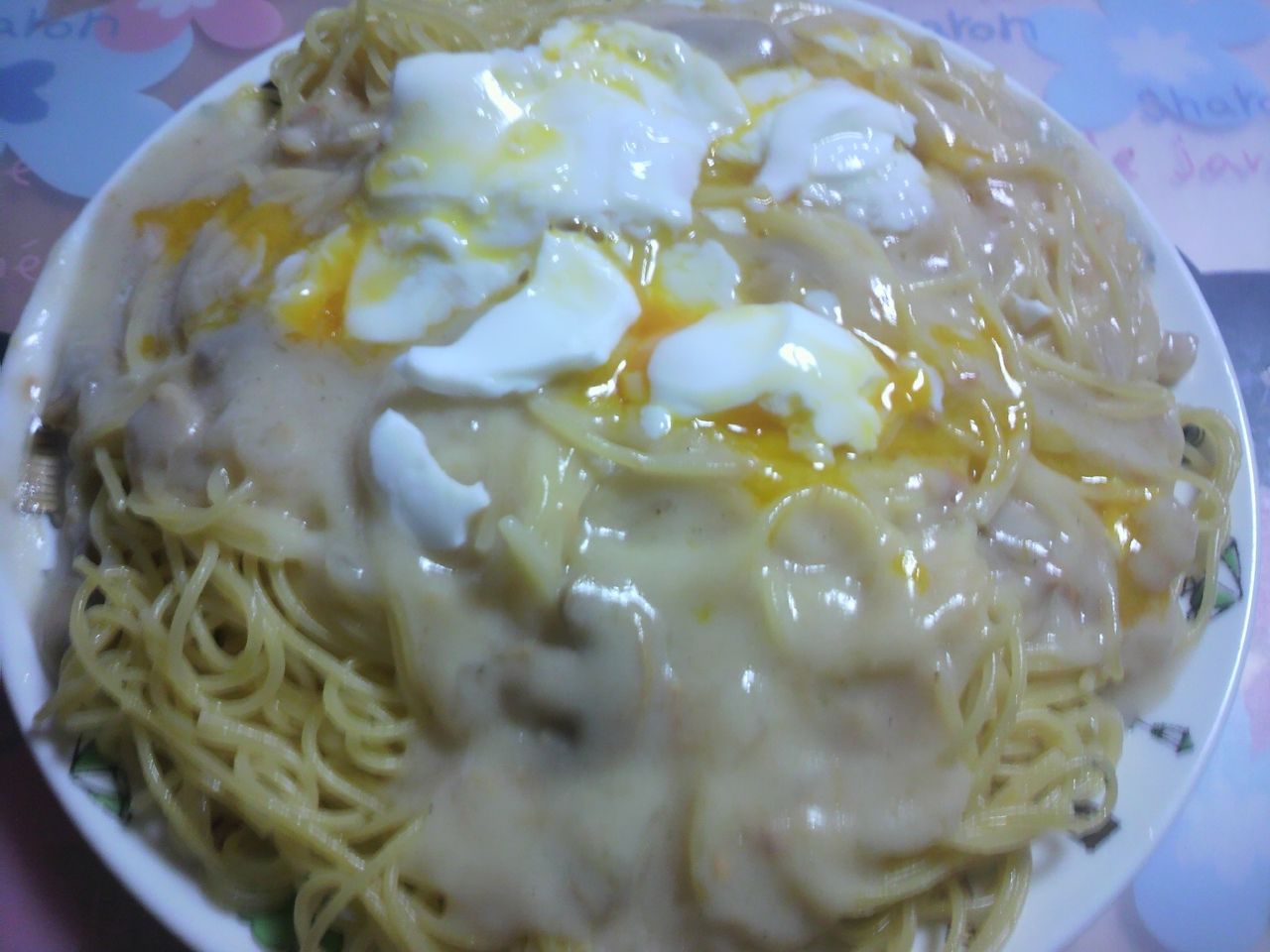 1 風吹けば名無し 2020/09/27(日) 21:34:48.36 ID:S6G3KmRt0 100円ショップの缶詰ホワイトソースと温泉卵で作ったうんめえカルボナーラ!!