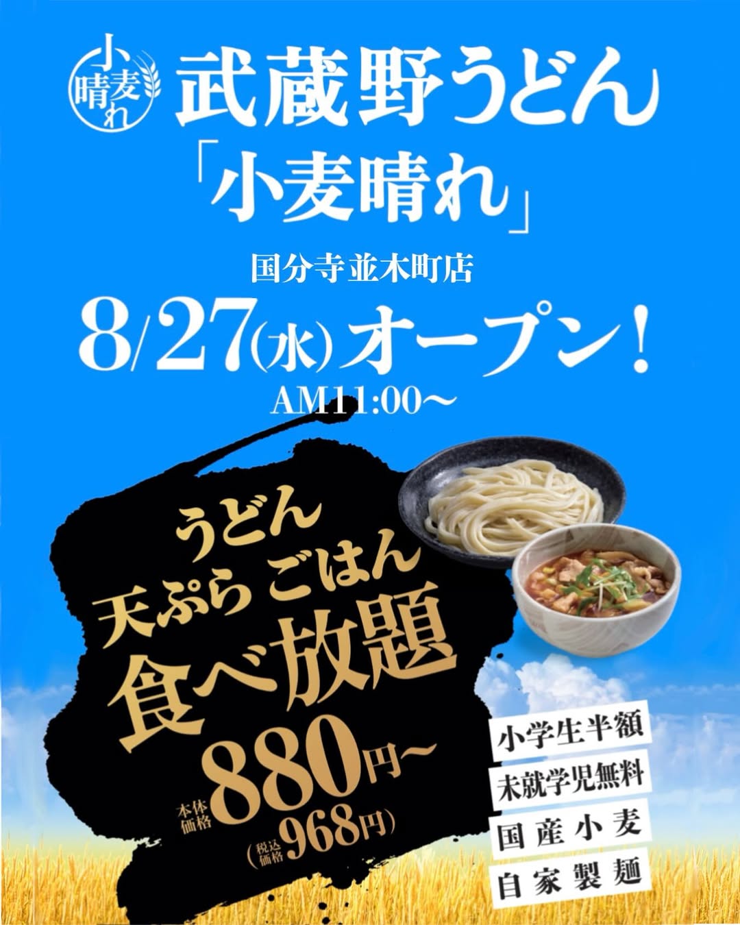 キッチンオリジンやれんげ食堂Toshuを展開するイオングループのオリジン東秀は、新業態「武蔵野うどん小麦晴れ(こむぎばれ)」を、8月27日(水)に東京都国分寺市並木町に初出店します。注目は、種類豊富な天ぷらやごはんをなんと食べ放題で自由に組み合わせることができるのだとか!うどんに乗せるのはもちろん、ごはんと合わせて自分だけの天丼にすることなども可能です。「麺・天ぷら・ごはん食べ放題」は最高すぎる!最強うどん店が東京に爆誕!!https://news.yahoo.co.jp/articles/924fb6e4795a78576c536b53fa4226f6477d3225続きを読む