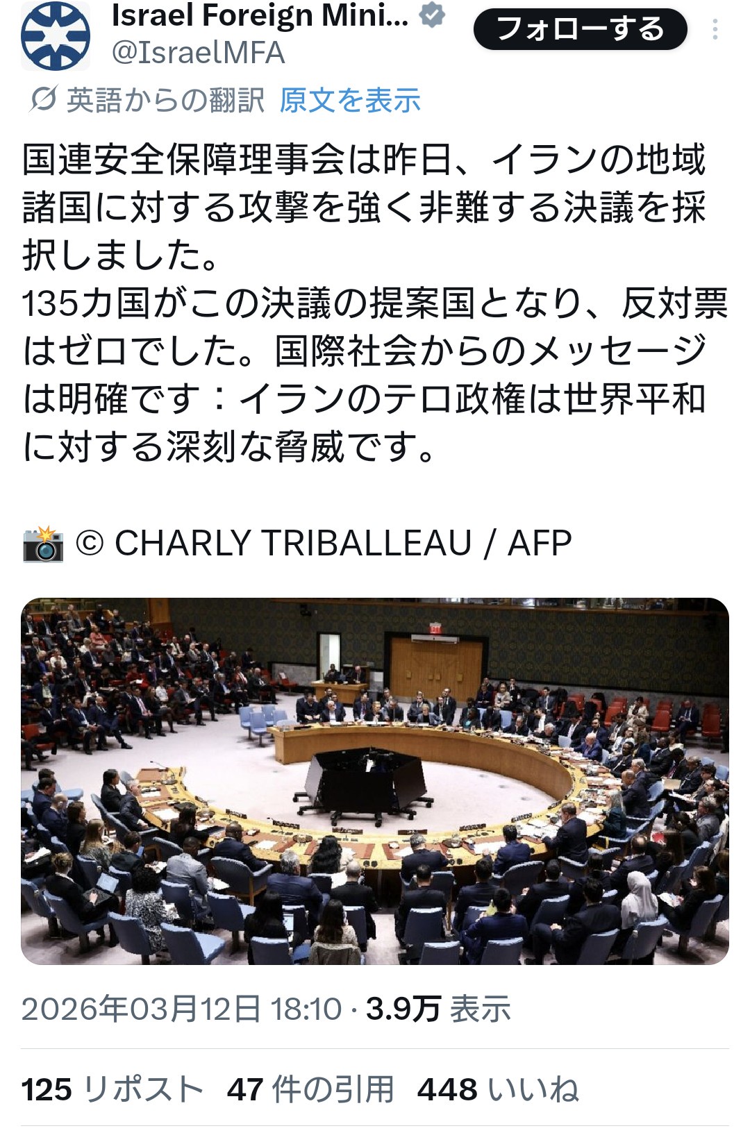 1:2026/03/13(金) 12:22:43.40 ID:cOwezQtT0●.netイスラエル外務省:「昨日、国連安全保障理事会は、イランによる地域諸国への攻撃を強く非難する決議を採択しました。135か国が共同提案国として名を連ね、反対票は一つもありませんでした。… https://t.co/2ihdxnigFs— イスラエル大使館 |Israel in Japan (@IsraelinJapan) March 12, 2026