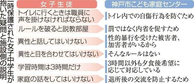 児童相談所の一時保護の在り方が問われる中、神戸市こども家庭センター(同市中央区)に保護された経験のある女子中学生と父親が神戸新聞社の取材に応じ、「異常」と映った規則と暮らしぶりを明らかにした。生徒は規則に反すると1人で小部屋に入れられるとし、児童の間で「説教部屋」と恐れられていると指摘。一方、施設側は「内省を促すため」とし、意識のずれを浮き彫りにした。(名倉あかり)