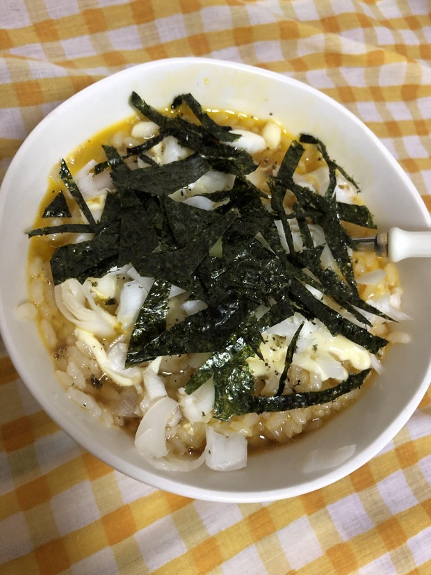 ご飯約1号卵2つマヨネーズたくさんめんつゆたくさん黒ごま少々ノリと長ネギを添えて