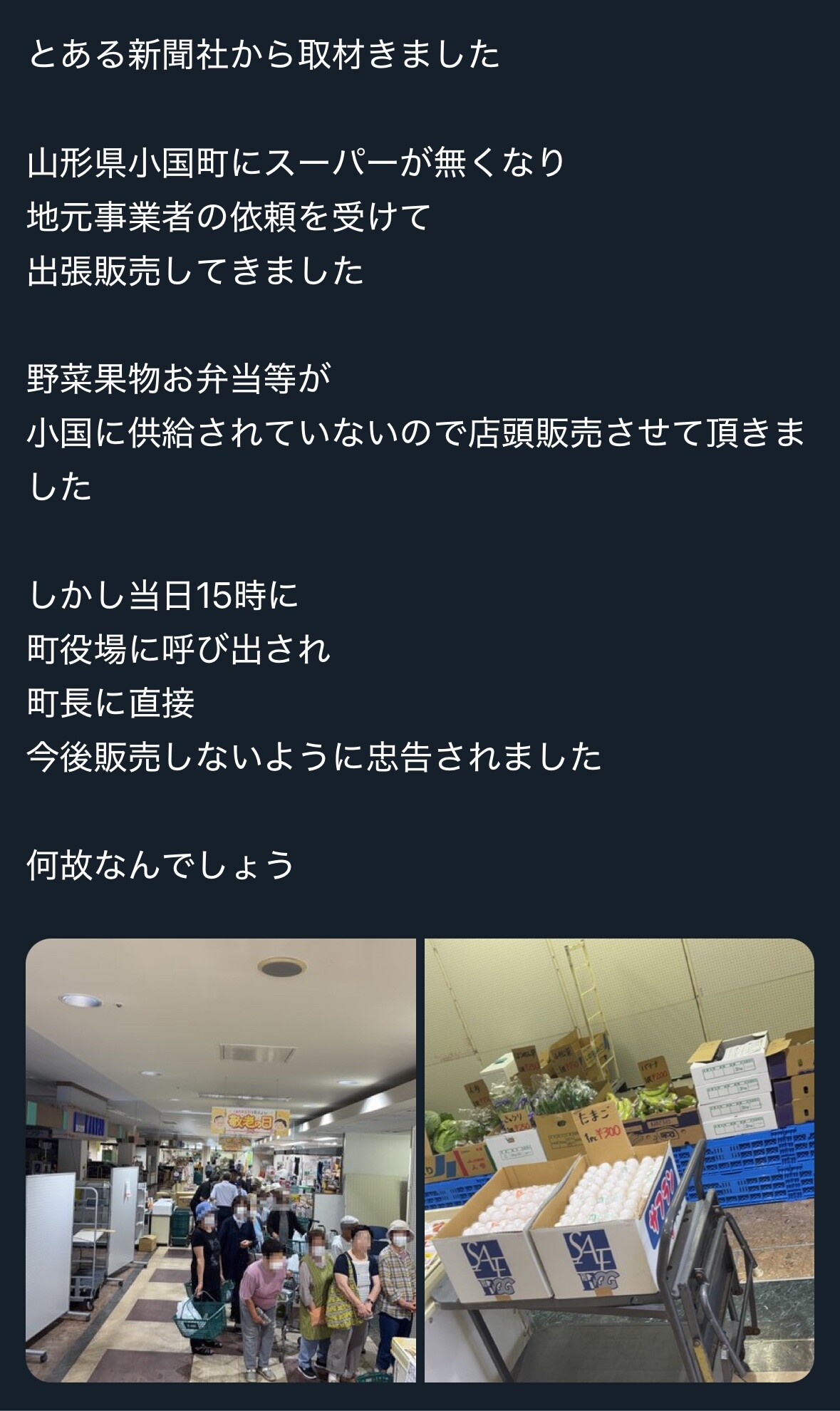 1 名前:名無しさん@おーぷん[] 投稿日:25/09/20(土) 09:46:13 ID:DZjY山形県小国町で唯一のスーパー「金十(かねじゅう)商店」が休業したため、新潟のスーパー「YZ(ワイシ?ー)マート」が出張販売したところ、町長から今後販売しないように忠告されたと、YZマートがXで投稿し、話題になっている。https://news.yahoo.co.jp/articles/32ff4754baedcc1bbbcb5a49b2e88de3fa4edf10