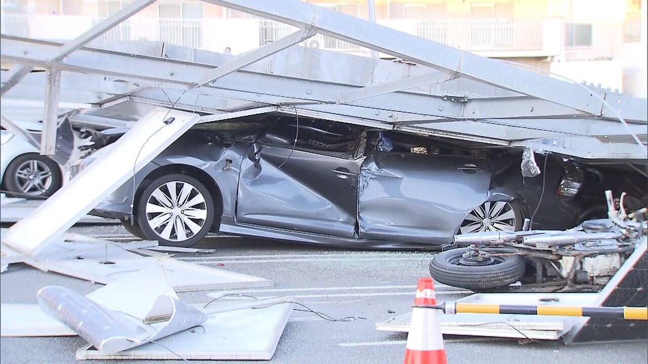 強風で簡単に倒れそうな大型ソーラーパネルが倒壊。車が潰れて1人ケガ。栃木
