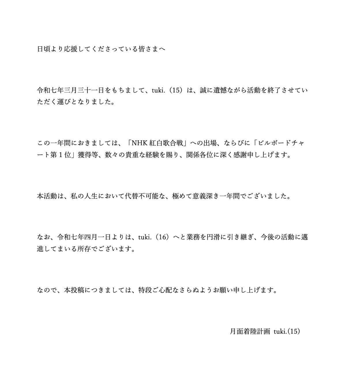 大切なお知らせ。 pic.twitter.com/NER5TOmFhf— tuki.(16) (@tuki_music_) March 31, 2025転載元スレッド:https://viper.2ch.sc/test/read.cgi/news4vip/1743422673/