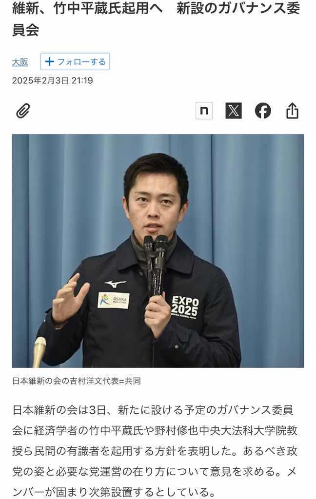 維新竹中平蔵 氏起用へ 新設のガバナンス委員会画像
