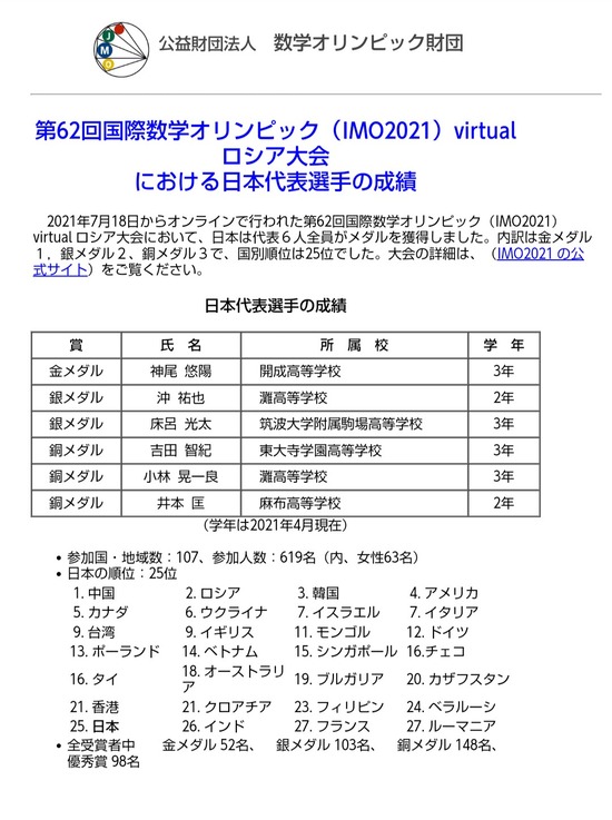 日本さん、数学オリンピック25位 ちな、韓国3位 中国1位