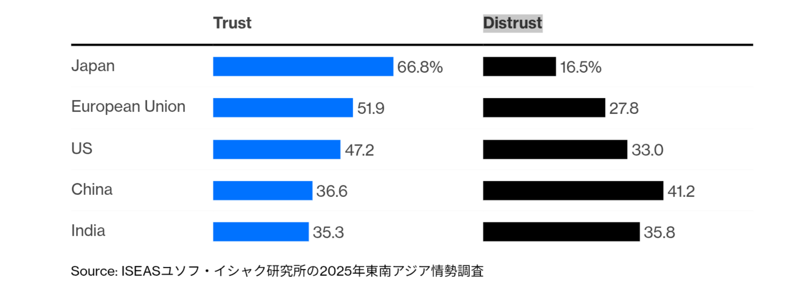 1:2025/12/06(土) 19:45:13.05 ID:CZRrLwgj0日本の信頼アップ、東南アジアで中国の言動裏目日本の信頼度が66.8%に上昇-2025年の東南アジア情勢調査中国に不信感を抱くとの回答は41.2%-ISEASユソフ・イシャク研究所Karishma Vaswani 2025年12月5日 at 13:09 JSTアジアの安全保障地図を塗り替えようとしている中国だが、新しい地図は意図した形にはならないもようだ。 南シナ海での放水銃による威嚇から台湾を巡る強硬な言動といった中国の振る舞いが、かつては想像できなかった安全保障環境を生み出している。アジアの周辺国が歓迎しているのは、地域の安定に寄与する役割を高めつつある日本だ。(省略)東南アジアでの信頼感主要国の中では日本が最も信頼されている