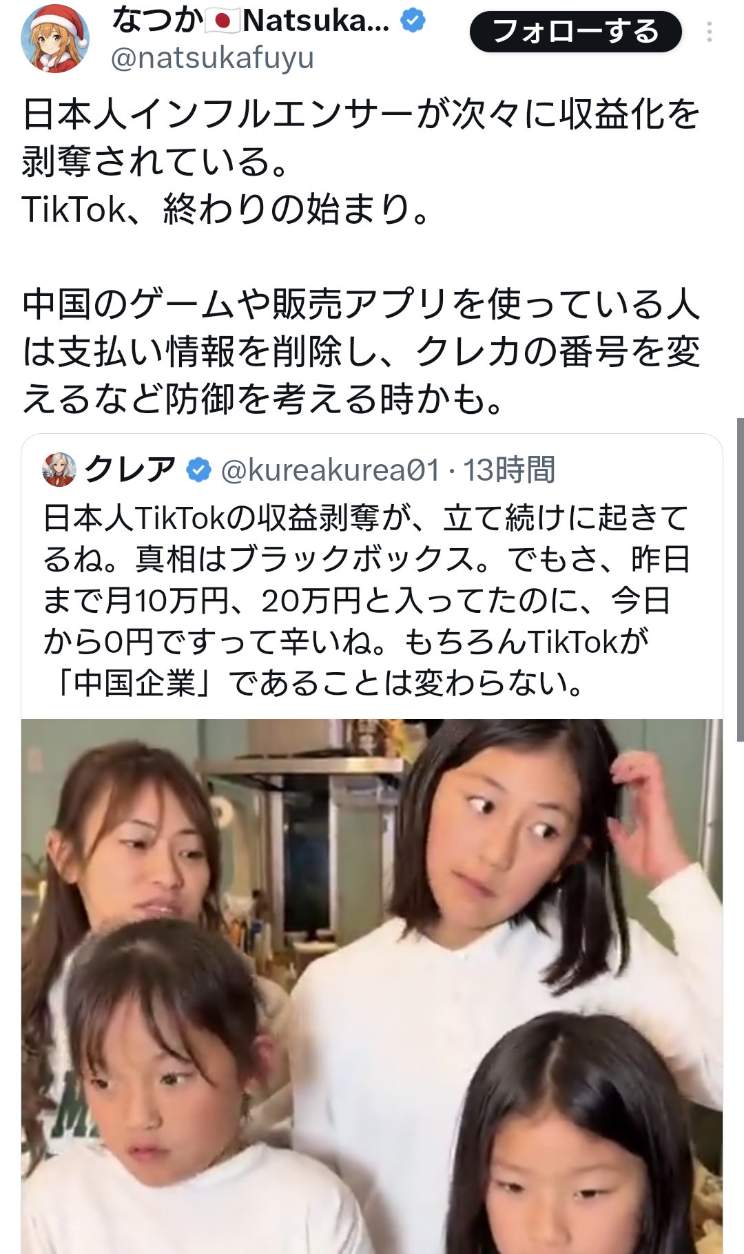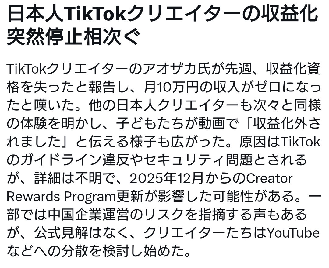 1:2025/12/10(水) 08:44:15.49 ID:v4OAga7b0日本人TikTokクリエイターの収益化突然停止相次ぐ日本人TikTokの収益剥奪が、立て続けに起きてるね。真相はブラックボックス。でもさ、昨日まで月10万円、20万円と入ってたのに、今日から0円ですって辛いね。もちろんTikTokが「中国企業」であることは変わらない。… https://t.co/RTaiqX93o6 pic.twitter.com/NEVv6brnUf— クレア (@kureakurea01) December 9, 2025TikTok収益剥奪問題、日本人クリエイターに波及https://search.yahoo.co.jp/realtime/search/matome/7b21ff7471c6419c8595f03f40820196-17652924192025年12月9日現在、TikTokにおいて日本人TikTokerが収益剥奪されているという投稿が多数見られる。投稿者の中には、自身のアカウントが収益化を停止された経験者や、収益剥奪の理由が不明瞭であることを指摘する声がある。また、中国企業であるTikTokの運営方針や日中関係悪化との関連性が指摘されるケースも見られる。転載元スレッド:https://hayabusa3.2ch.sc/test/read.cgi/news/1765323855/