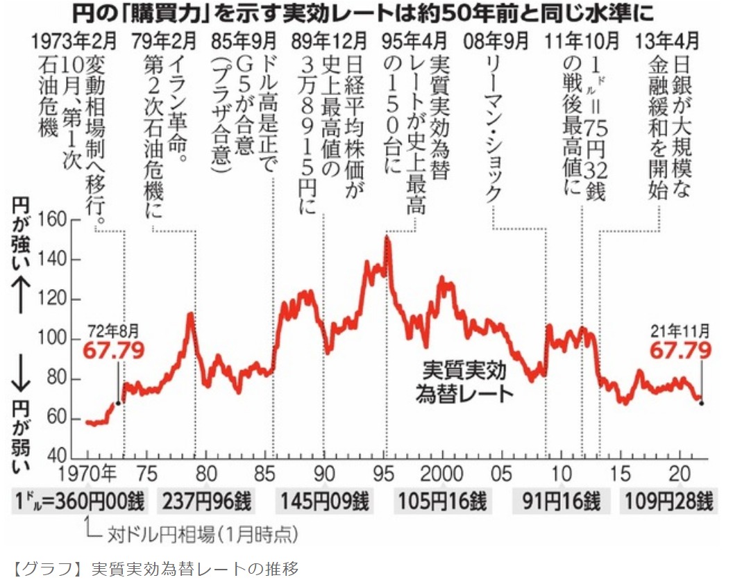 ほかの国の通貨に比べ、日本円はモノを買う力が強いのか弱いのか。そんな通貨の購買力を示す国際指標で、日本円が約50年前の水準まで下がっていることが分かった。この1年で急激に円安が進んだのも一因だ。その分、輸入に頼る原油や食材などが値上がりするなど、暮らしへの影響も広がり始めている。 この指標は、国際決済銀行(BIS)が毎月公表しており、「実質実効為替レート」と呼ばれる。約60カ国・地域の通貨を比較し、各国の物価水準なども考慮して総合的な通貨の実力を示す。数値が低いほど、海外からモノを買う際の割高感が高まる。円安が進むと、海外旅行で何かと割高に感じるのと同じだ。 この指標をみると、日本円は昨年5月に80以上だったが、海外でコロナ後の景気回復への期待が先行して円安基調となり、下落傾向が続いた。今年10月に70を割り込み、11月に67・79まで下落。これは同様に円安が進んだ15年6月以来の水準で、1972年8月と同じ値だ。過去最高だったのは、一時1ドル=79円台まで円高が進んだ95年4月で150・85だったので、その当時と比べ、大幅に海外のモノが高く感じる状態になっている。https://www.asahi.com/sp/articles/ASPDW632JPDQULFA034.html 2 チタニア(光) [US] 2021/12/28(火) 22:17:51.24 ID:v5xZmdZl0 ものを作らなくなったからだよ 10 テンペル・タットル彗星(光) [TW] 2021/12/28(火) 22:20:19.41 ID:VOKZZ0Jy0 >>2