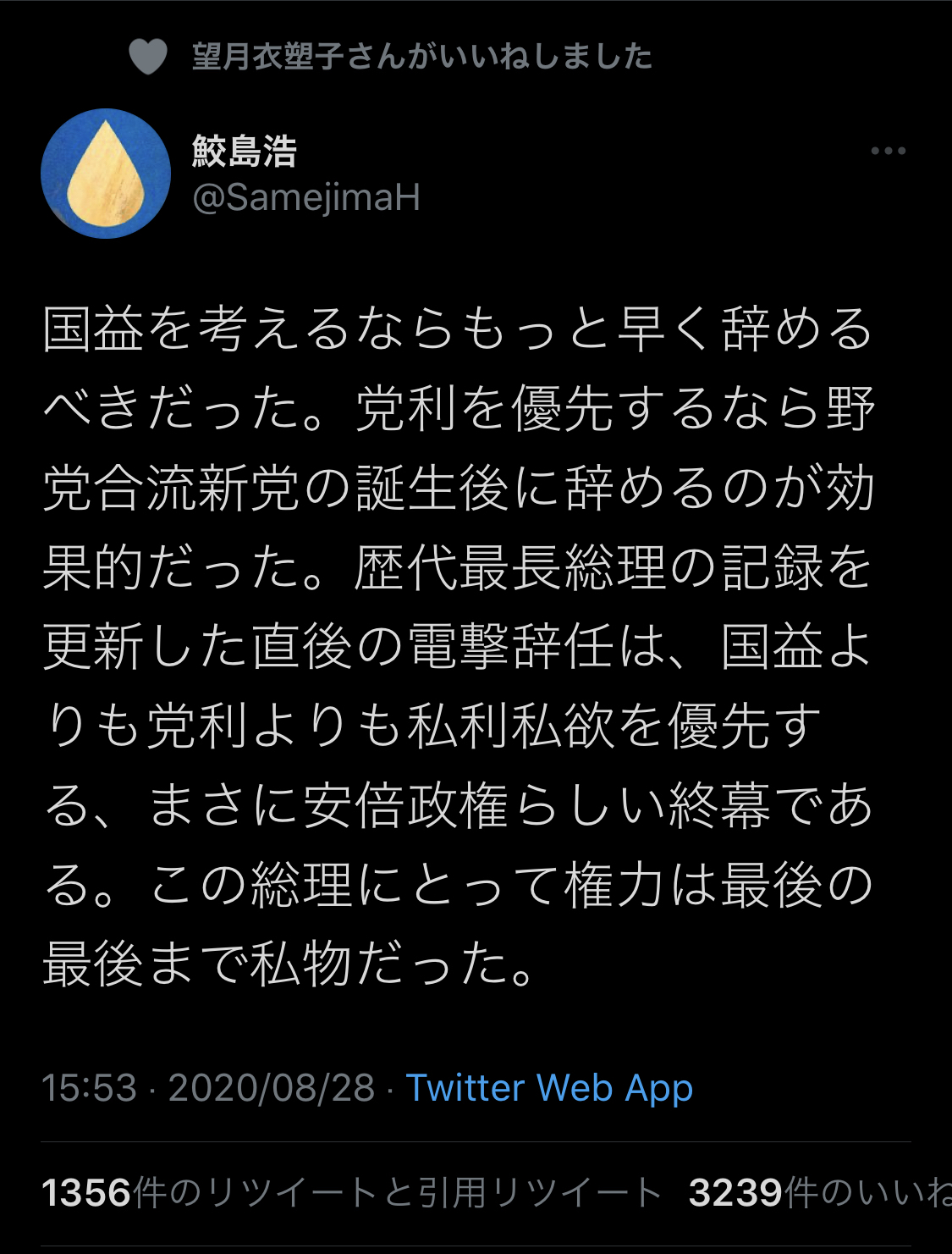国益を考えるならもっと早く辞めるべきだった。党利を優先するなら野党合流新党の誕生後に辞めるのが効果的だった。歴代最長総理の記録を更新した直後の電撃辞任は、国益よりも党利よりも私利私欲を優先する、まさに安倍政権らしい終幕である。この総理にとって権力は最後の最後まで私物だった。— 鮫島浩 (@SamejimaH)