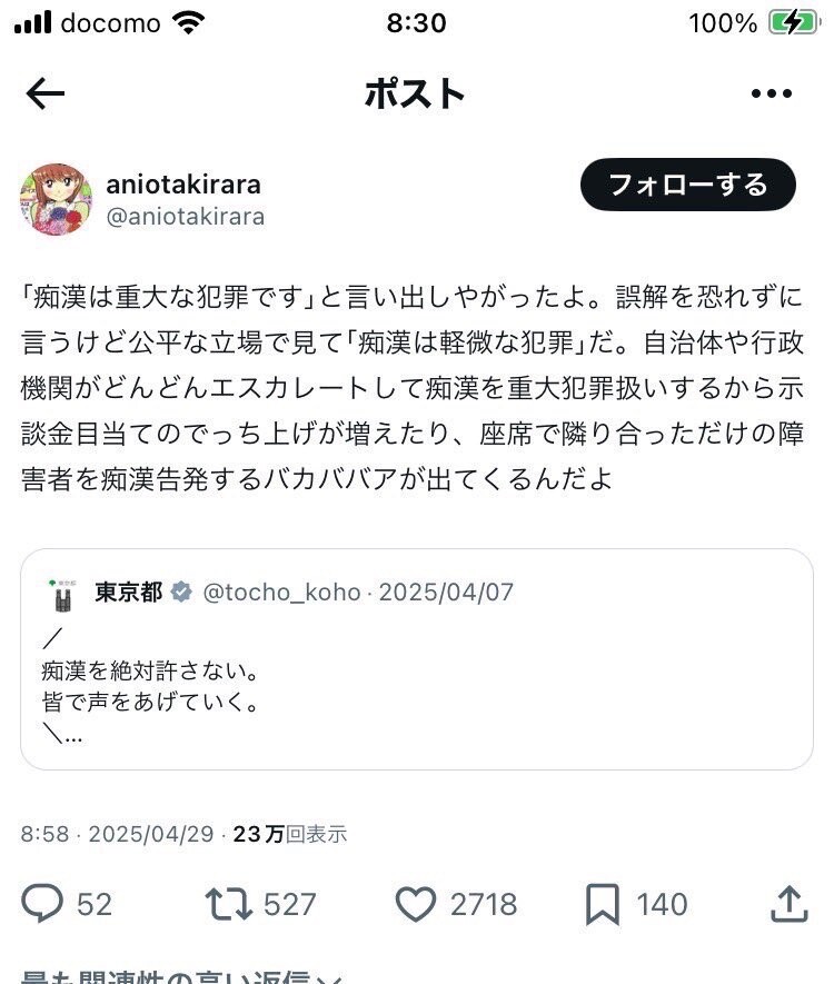 東京都公式「痴漢は重大な犯罪です」←弱男「軽微な犯罪だろ!ギャオオオオオオオン!!」と炎上させる