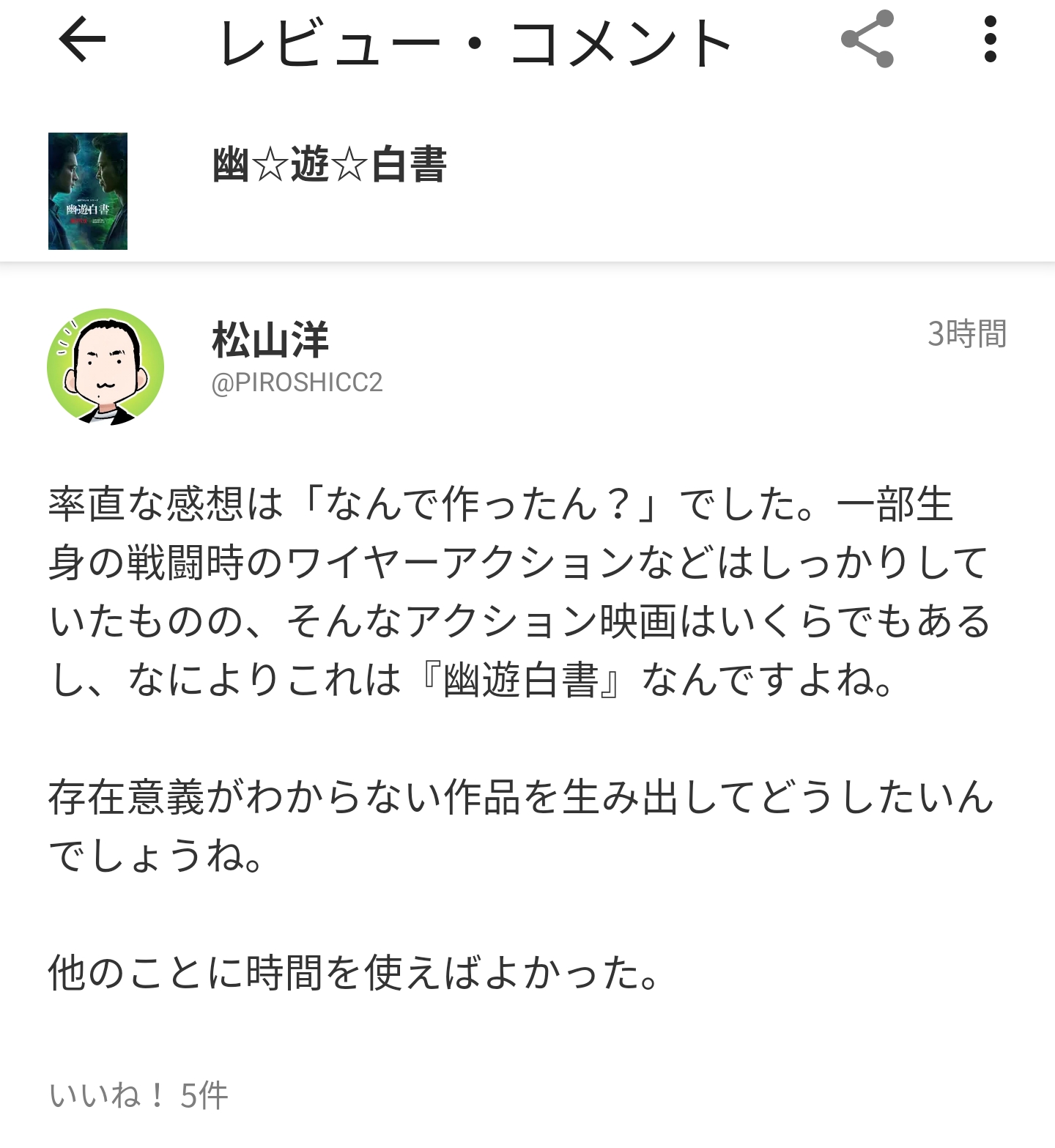 松山洋が実写版幽遊白書に苦言「なんで作ったん?存在意義がわからない」