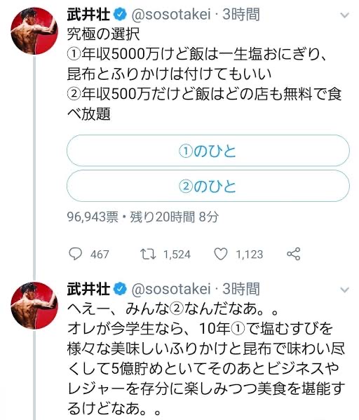武井壮「年収5000万で一生塩むすびか、年収500万だが、ただでメシ食える。どっち選ぶ」