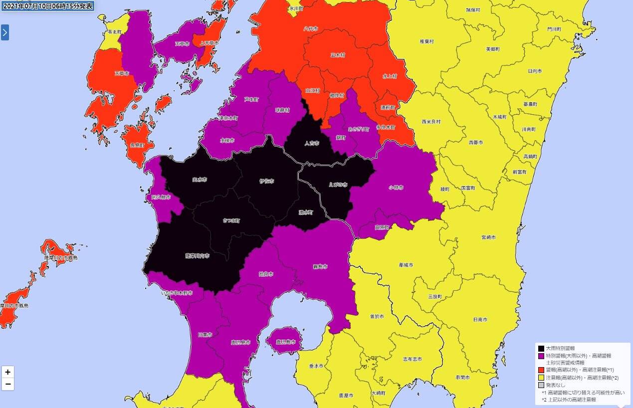 【最大級の警戒を!】鹿児島県、宮崎県、熊本県の市町村に大雨特別警報を発表。6時30分より記者会見を行います。これらの地域では何らかの災害がすでに発生している可能性が極めて高く警戒レベル5に相当。命の危険が迫っているため直ちに身の安全を確保してください。 pic.twitter.com/YIylaiQrK0— 気象庁防災情報 (@JMA_bousai) July 9, 2021