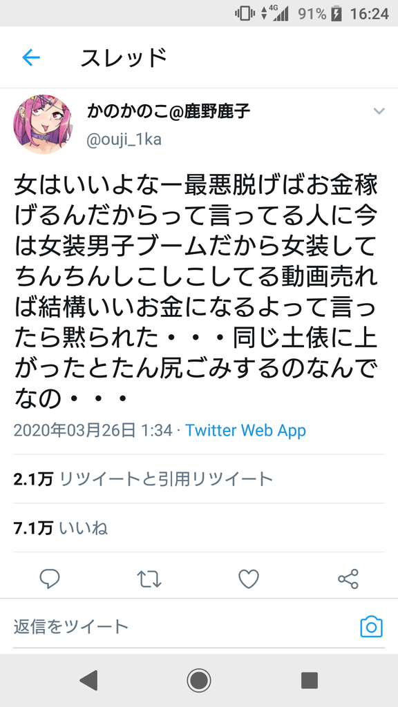 激おこまんさん「女は体売ればいいから楽だって言うなら女装してちんちんシコシコする動画売ってみろよ」