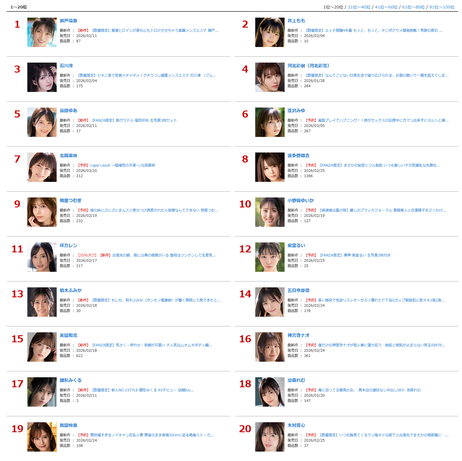 1 名前:名無しさん@おーぷん[] 投稿日:26/02/17(火) 14:58:03 ID:E2We十年前は粒揃いやったのに2 名前:名無しさん@おーぷん[] 投稿日:26/02/17(火) 14:58:16 ID:HVif鷲尾めい3 名前:名無しさん@おーぷん[] 投稿日:26/02/17(火) 14:58:19 ID:E2We素人系でしか抜けななった5 名前:名無しさん@おーぷん[] 投稿日:26/02/17(火) 14:58:32 ID:vloH>>3わかるなんかサイボーグみたいなの増えすぎ6 名前:名無しさん@おーぷん[] 投稿日:26/02/17(火) 14:58:35 ID:ejbQ姫咲はな8 名前:名無しさん@おーぷん[] 投稿日:26/02/17(火) 14:59:10 ID:hptP木下ひまり続きを読む