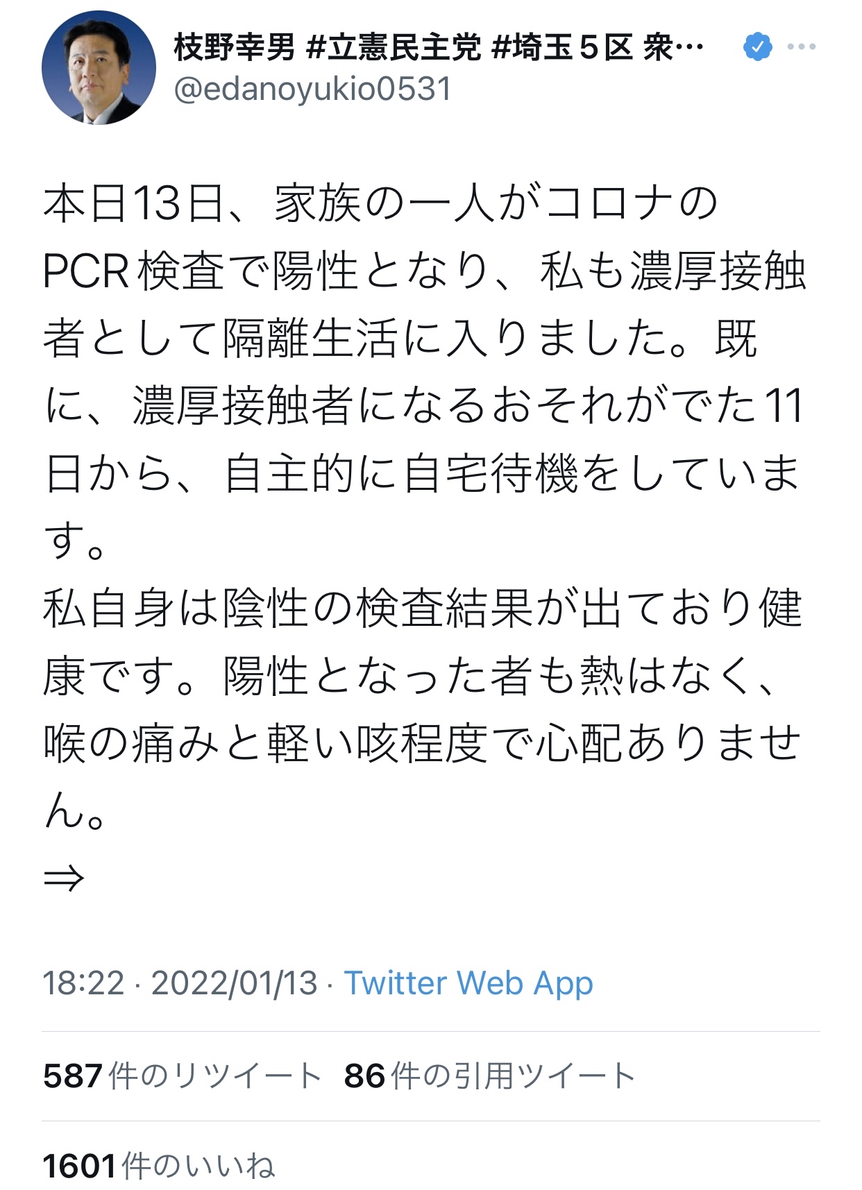 1:2022/01/13(木) 21:04:46.22 ID:1vp9QCwM0⇒当面、人との接触が原則としてできなくなります。この間、恐縮ですが、多くの皆さんに、事務所を通じて予定の変更などをお願いすることとなります。この場を借りてご報告し、ご理解をお願いいたします。オミクロン株は相当広範に広がっているようです。皆さんも十分にご注意ください。— 枝野幸男 #立憲民主党 #埼玉5区 衆議院議員 (@edanoyukio0531) January 13, 2022