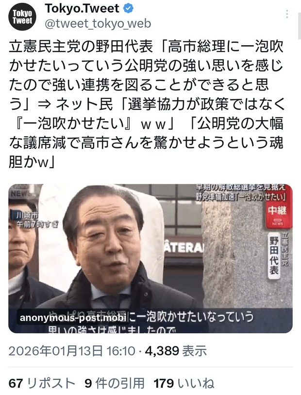 立憲民主党の野田代表「高市総理に一泡吹かせたいっていう公明党の強い思いを感じたので強い連携を図ることができると思う」⇒ ネット民「選挙協力が政策ではなく『一泡吹かせたい』ww」「公明党の大幅な議席減で高市さんを驚かせようという魂胆かw」