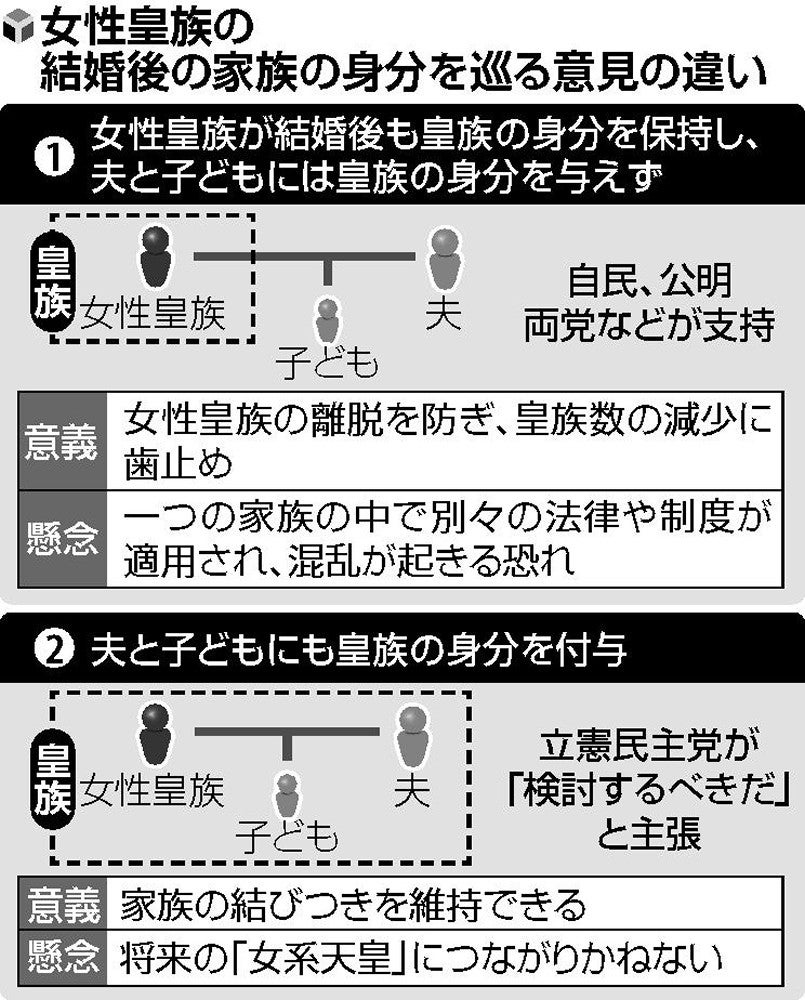 (省略) 女性皇族が結婚後も皇族の身分を保持することに関しては各党がおおむね賛同しており、夫と子どもの扱いが論点となった。出席した立民の野田佳彦・元首相は、夫と子どもにも皇族の身分を付与することも検討すべきだと改めて主張した。自身が首相だった民主党政権時に、夫や子どもも皇族とすることを念頭に置いた「女性宮家」創設を提案しており、家族の一体性を重視しているためだ。 自民や日本維新の会は、子どもに皇族の身分を付与することは、母方のみが天皇の血を引く「女系天皇」につながることを懸念している。一方で、家族内で皇族と一般国民に分かれることで混乱が起きる恐れも指摘されており、着地点は見えていない。(省略)全文