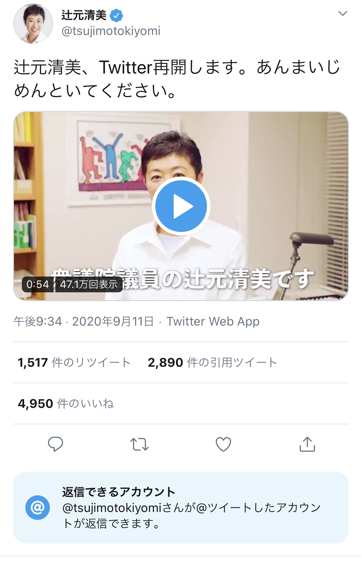 辻元清美、Twitter再開します。あんまいじめんといてください。