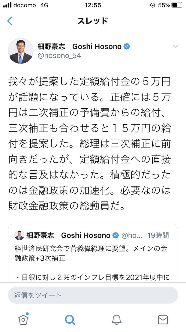 我々が提案した定額給付金の5万円が話題になっている。正確には5万円は二次補正の予備費からの給付、三次補正も合わせると15万円の給付を提案した。総理は三次補正に前向きだったが、定額給付金への直接的な言及はなかった。積極的だったのは金融政策の加速化。必要なのは財政金融政策の総動員だ。 https://t.co/UCRuJJwCnz— 細野豪志 Goshi Hosono (@hosono_54) October 14, 2020転載元スレッド:https://swallow.5ch.net/test/read.cgi/livejupiter/1602736620/続きを読む