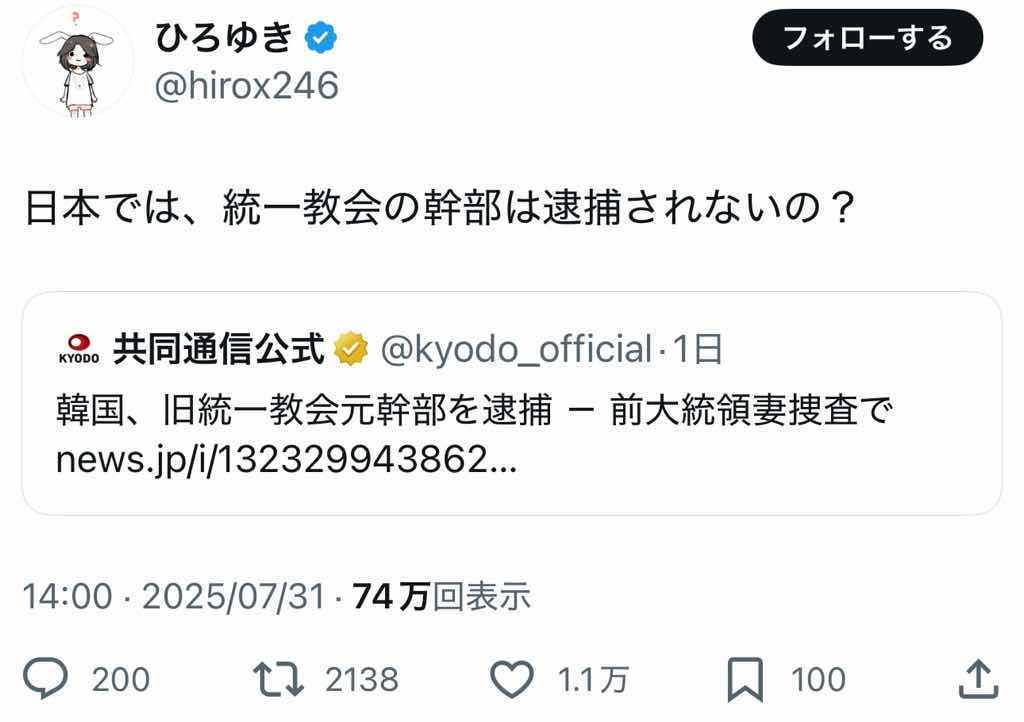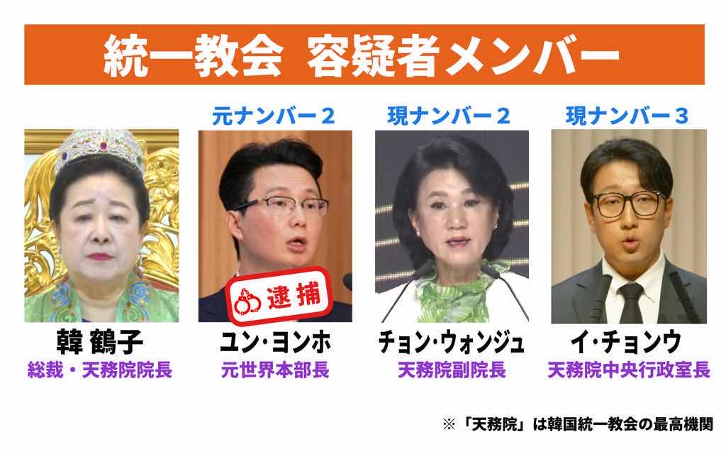 統一教会ナンバー2 逮捕wwwwwwwww韓国で旧統一教会の元幹部を逮捕 前大統領妻を巡る事件で 現地報道逮捕されたのは、かつて旧統一教会の「世界本部長」を務めたユン・ヨンホ容疑者。ユン容疑者は逮捕前の任意の調べに対し容疑を認め、「韓総裁の決裁を受けた」と主張したという。教団側は、ユン容疑者の個人的な行動だとして関与を否定している。統一教会ナンバー2 尹英鎬(ユン・ヨンホ)
