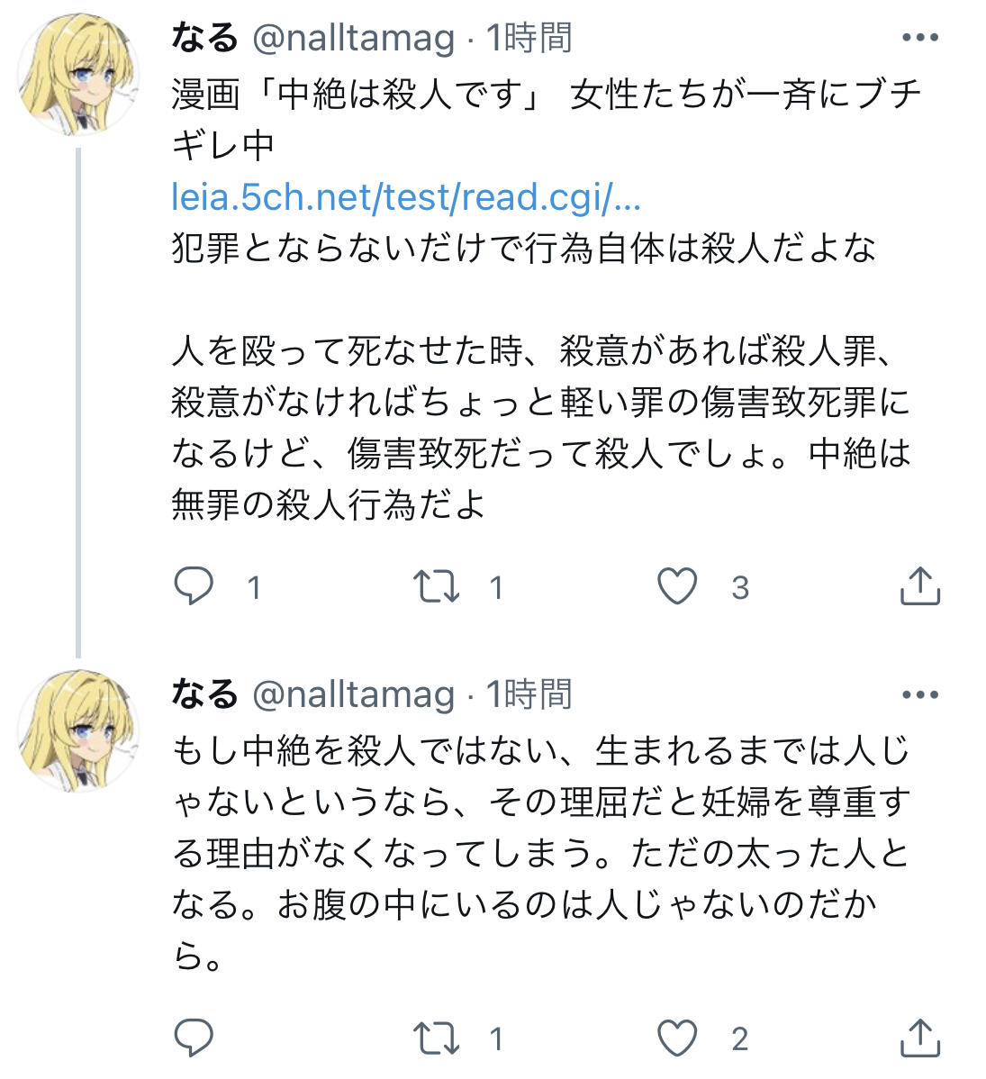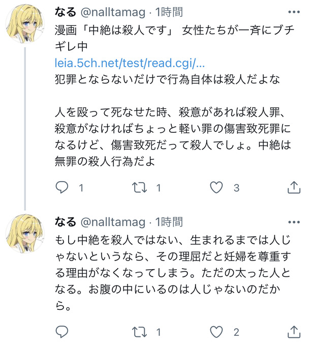 漫画「中絶は殺人です」 女性たちが一斉にブチギレ中 https://t.co/oUJAzOUR8P犯罪とならないだけで行為自体は殺人だよな人を殴って死なせた時、殺意があれば殺人罪、殺意がなければちょっと軽い罪の傷害致死罪になるけど、傷害致死だって殺人でしょ。中絶は無罪の殺人行為だよ— なる (@nalltamag) July 31, 2021転載元スレッド:https://swallow.5ch.net/test/read.cgi/livejupiter/1627715175/