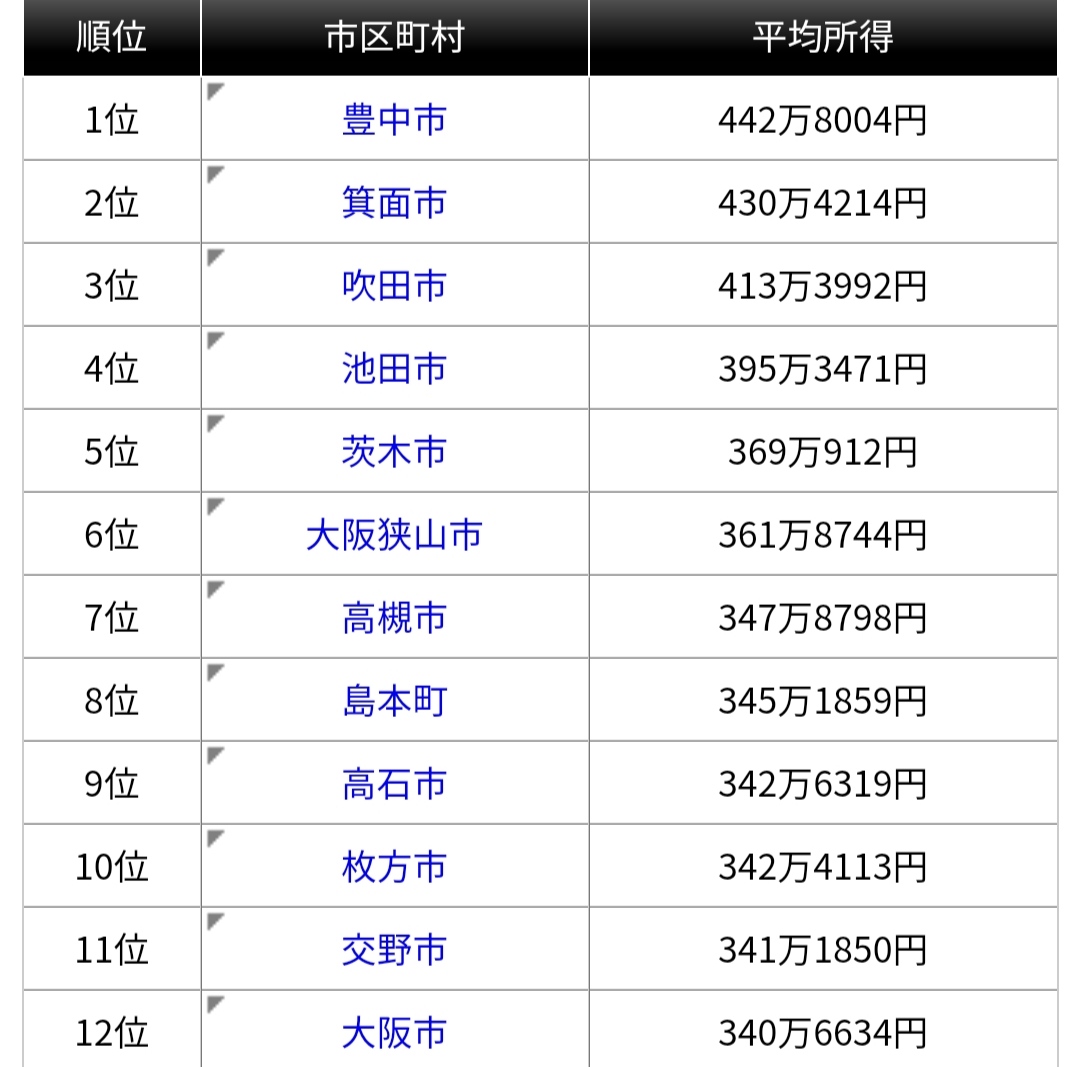 豊中「平均所得は442万です」箕面「430万です」吹田「413万です」ワイ「大阪市は500万くらいかな」