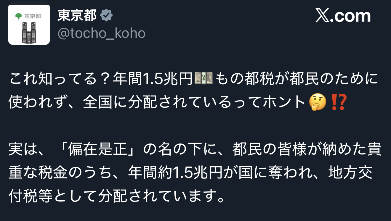 1 : 以下、?ちゃんねるからVIPがお送りします :2025/12/12(金) 13:38:15.897 ID:2yuoPR8K01212.netこれ知ってる?年間1.5兆円💴もの都税が都民のために使われず、全国に分配されているってホント🤔⁉ 実は、「偏在是正」の名の下に、都民の皆様が納めた貴重な税金のうち、年間約1.5兆円が国に奪われ、地方交付税等として分配されています。 🤔都税は東京の行政サービスに使われるべきものでは?… pic.twitter.com/DMKGmRvaiZ— 東京都 (@tocho_koho) December 9, 2025