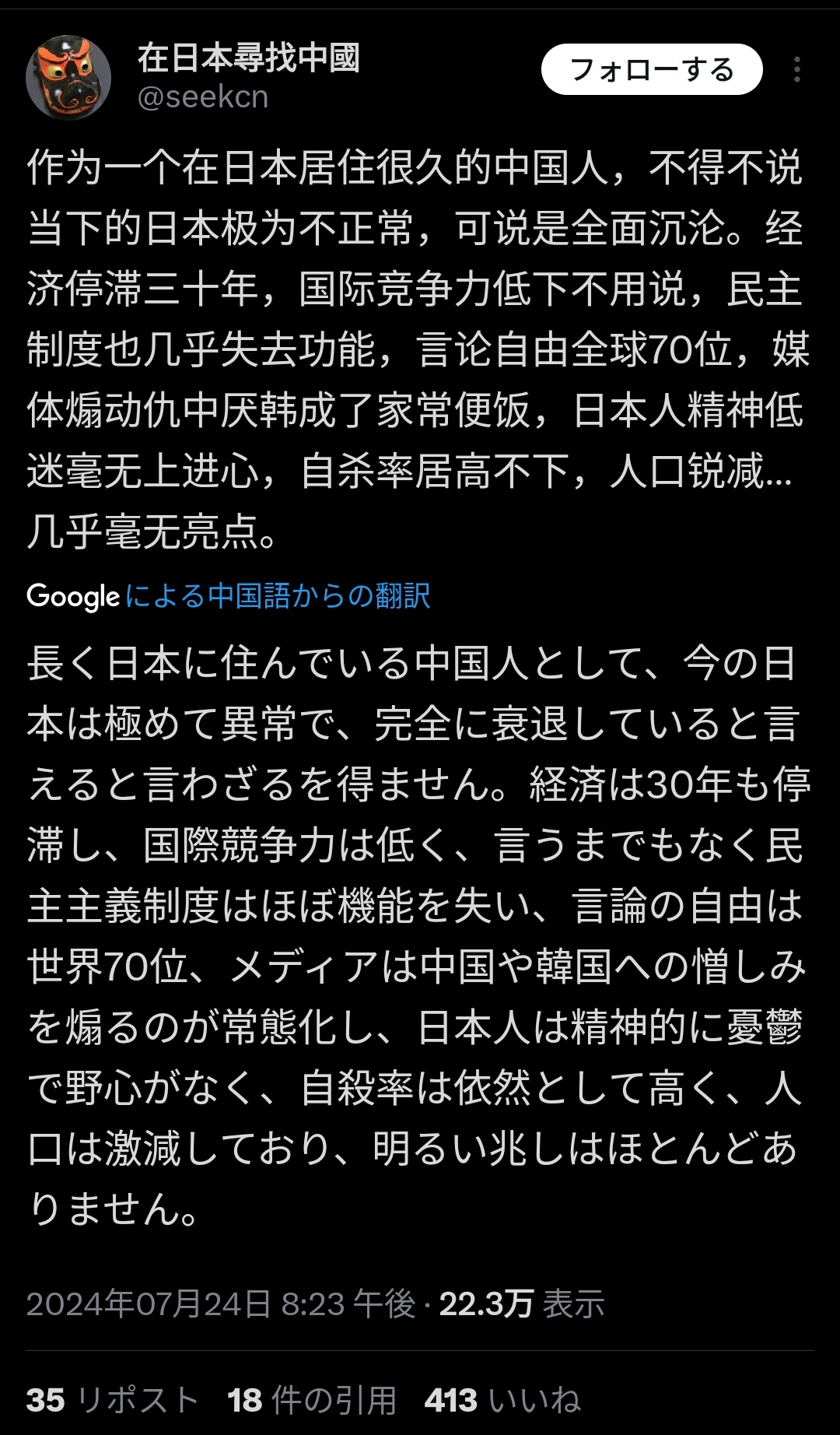 ソース作为一个在日本居住很久的中国人,不得不说当下的日本极为不正常,可说是全面沉沦。经济停滞三十年,国际竞争力低下不用说,民主制度也几乎失去功能,言论自由全球70位,媒体煽动仇中厌韩成了家常便饭,日本人精神低迷毫无上进心,自杀率居高不下,人口锐减…几乎毫无亮点。— 在日本尋找中國 (@seekcn)