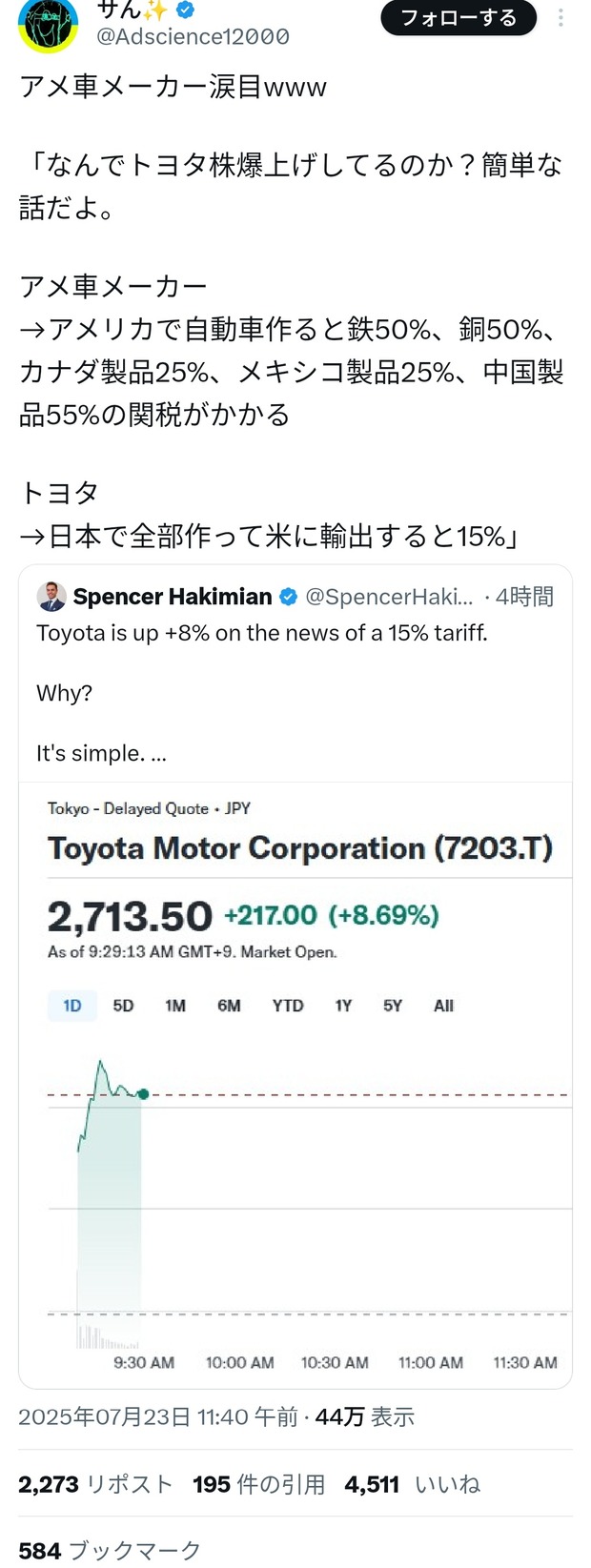 アメ車メーカー涙目www「なんでトヨタ株爆上げしてるのか?簡単な話だよ。アメ車メーカー→アメリカで自動車作ると鉄50%、銅50%、カナダ製品25%、メキシコ製品25%、中国製品55%の関税がかかるトヨタ→日本で全部作って米に輸出すると15%」 https://t.co/TMX9S8b4V9— サん✨ (@Adscience12000) July 23, 2025転載元スレッド:https://hayabusa3.2ch.sc/test/read.cgi/news/1753248516/続きを読む