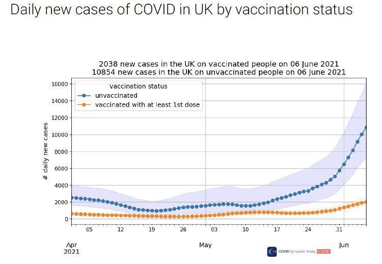 感染力が強いデルタ株(インド株)が流行しつつあると言われるイギリスの最新の感染状況。ブルーはワクチンを打ってない人、オレンジは少なくとも1回はワクチンを打ってる人。これを見てもワクチンの効果は凄まじい。日本においても速やかにワクチンを広げることが重要だ。