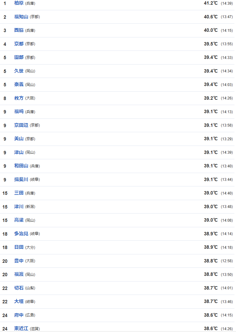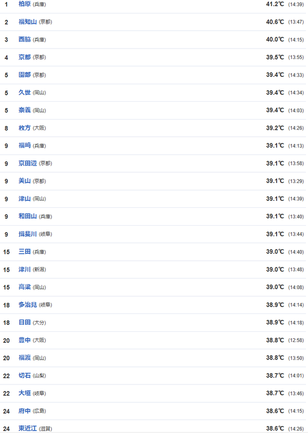 1位 兵庫 柏原 41.2℃ 国内最高を更新