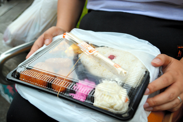 TENOHASIの支援活動で配布された弁当をひざの上に置いて取材に応じた26歳の女性=東京都豊島区