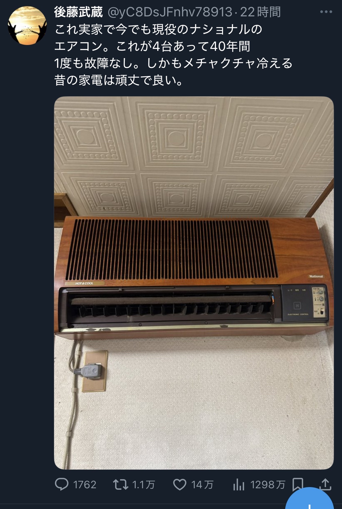 これ実家で今でも現役のナショナルのエアコン。これが4台あって40年間1度も故障なし。しかもメチャクチャ冷える昔の家電は頑丈で良い。 pic.twitter.com/0SbfYKnZcf— 後藤武蔵 (@yC8DsJFnhv78913) July 10, 2025転載元スレッド:https://viper.2ch.sc/test/read.cgi/news4vip/1752232980/