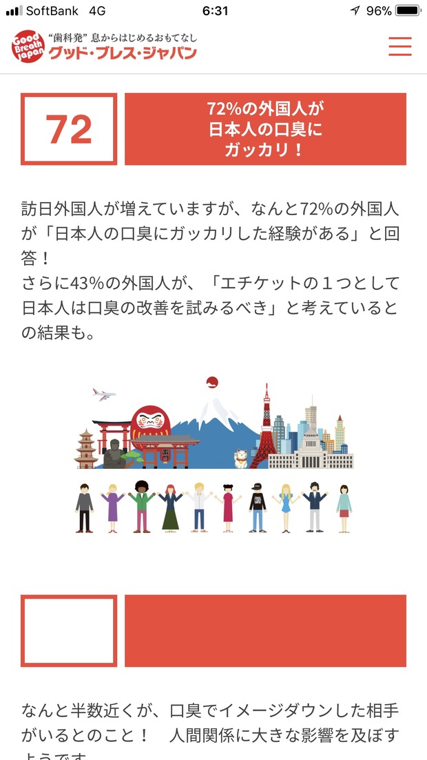 訪日外国人が増えていますが、なんと72%の外国人が「日本人の口臭にガッカリした経験がある」と回答!さらに43%の外国人が、「エチケットの1つとして日本人は口臭の改善を試みるべき」と考えているとの結果も。画像