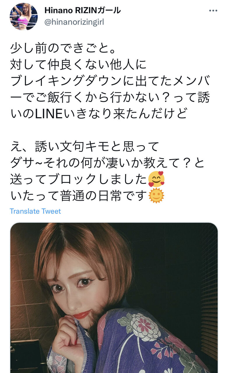 RIZINガールのHinanoが10日、ツイッターを更新。格闘技エンターテインメント「BreakingDown」出場者に感じた不快感を明らかにしている。